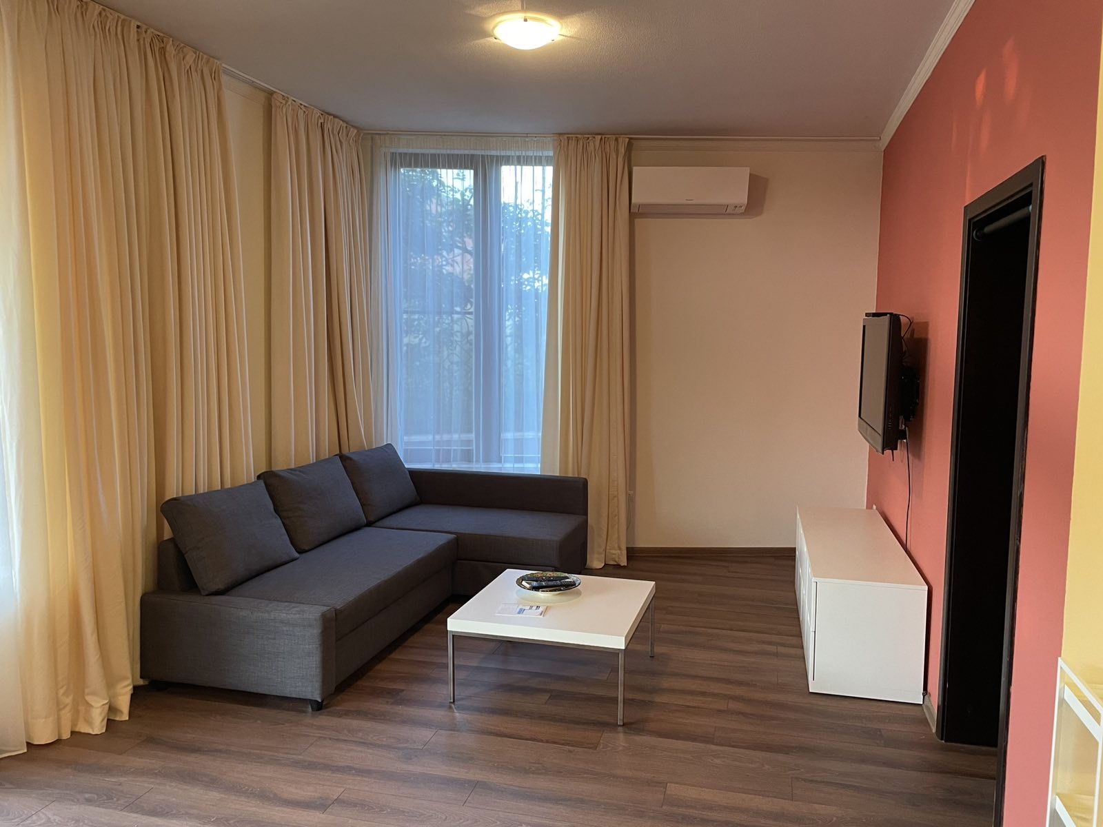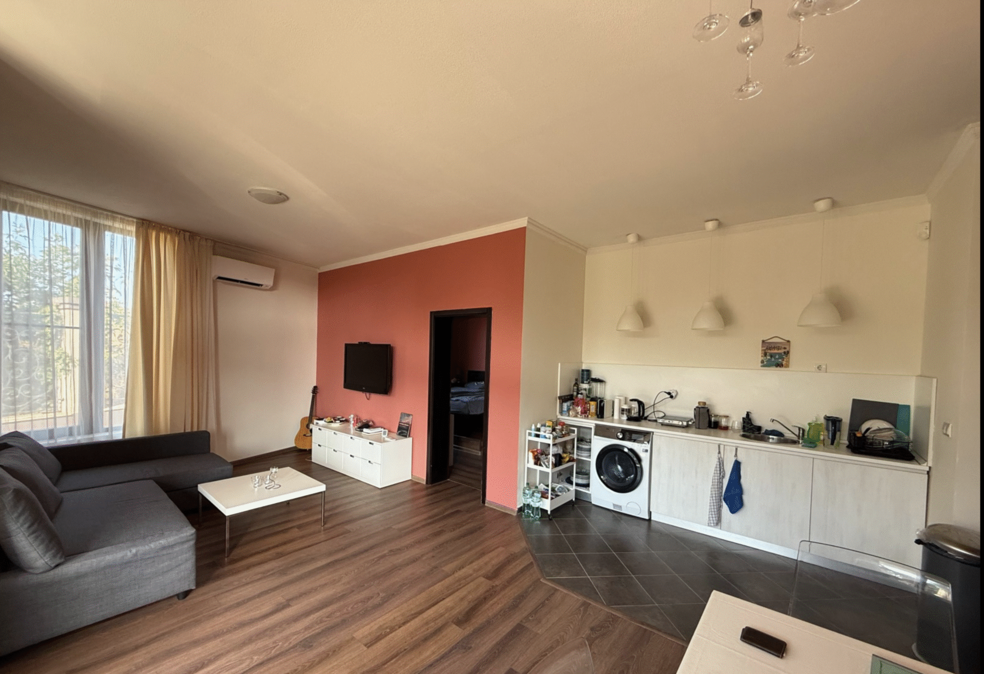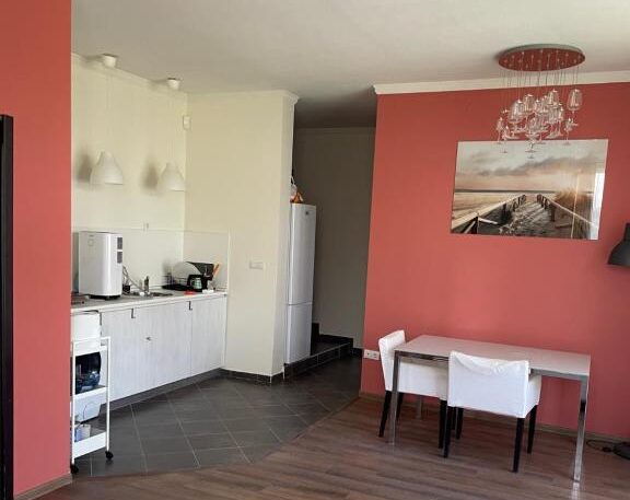В апартамента ще откриете просторна дневна с малък бокс разполагащ с базови кухненски удобства, две отделни спални, диван, две бани и прекрасна тераса с мека мебел с излаз към малък споделен озеленен вътрешен двор. Помещенията имат модерен характер съчетан с домашен уют, допълнен от практичност и удобство.
